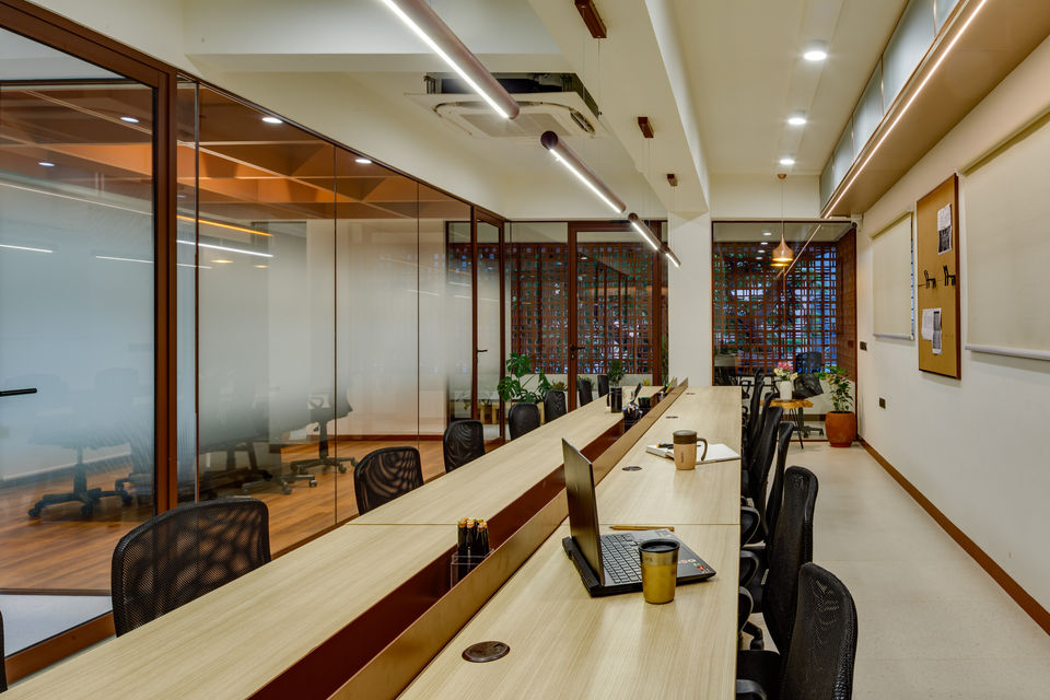 The office palette is graced with earthy tones, embracing furniture and decor selections that emanate a sense of grounded serenity. An intricately designed false ceiling adds depth and elegance, contributing to the overall aesthetic. A highlight of the office is the Terracotta Jali, serving as a natural light source, infusing the space with warmth, and acting as an artistic focal point. This delicate play of light and form creates a welcoming yet professional environment.