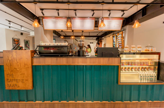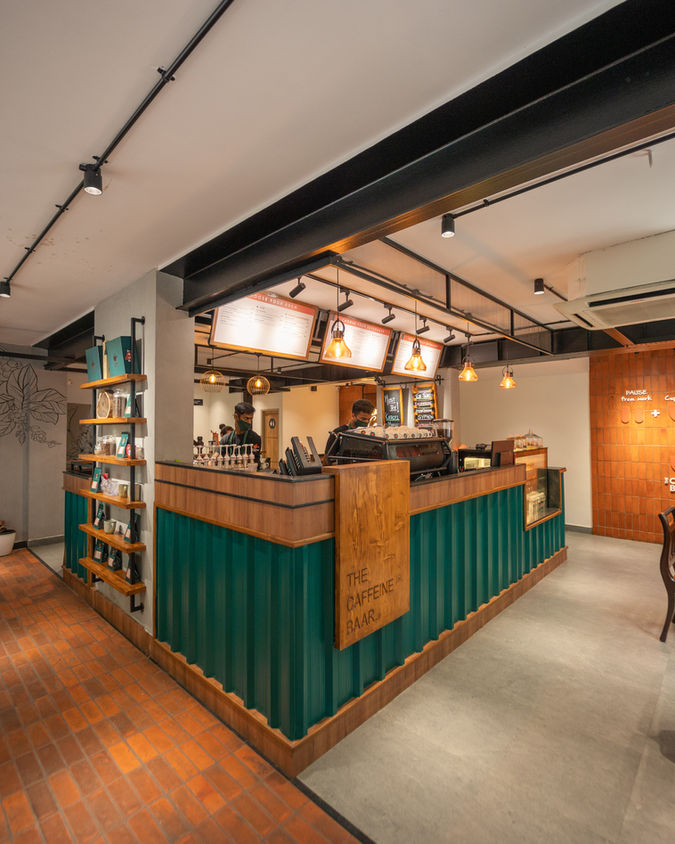 The Caffeine Baar is designed as the first outlet for the brands Pause and Play concept. The brand is estate owned, so the space also is designed to double up as the experience centre and incubation kitchen for the brand.
